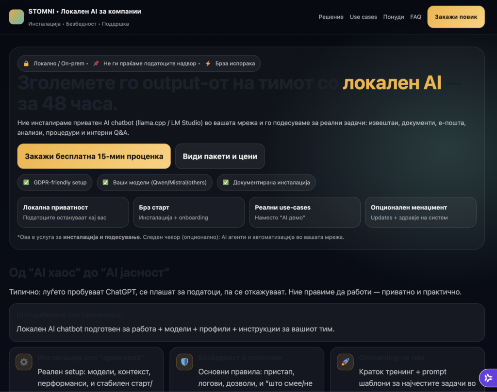 Наместо “ајде да пробаме ChatGPT”, добивате приватен систем со правила, модели и јасни use cases — за да има резултат, не само ентузијазам.